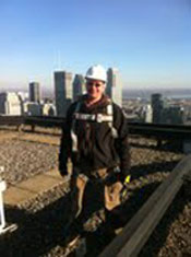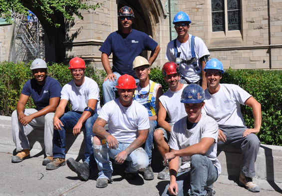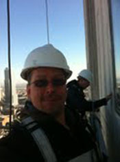 (ci-dessus) faisant la supervision et l’inspection du travail de restauration, sur un échafaudage volant, 32 étages au-dessus du niveau de la rue. L'équipe de spécialistes du travail en hauteur de KB Groupe Construction